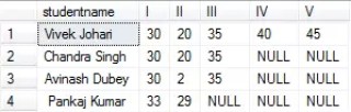 Create table tbl_stdmarksdata (studentname nvarchar(100), I int, II int, III int, IV int, V int)
