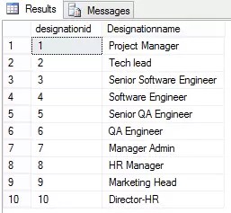 Create table tbl_Designation (designationid int identity(1,1), Designationname nvarchar(150)) Create table tbl_Employee(Empid int identity(1,1), NationalIdNumber varchar(100) , EmpFirstname nvarchar(100),Emplastname nvarchar(100),Birthdate datetime,Hiredate datetime, MaritalStatus nvarchar(10), Loginid nvarchar(100), emppassword nvarchar(20), Gender nvarchar(10),Enddate datetime) Create table tbl_emp_designation (empdesignationid int identity(1,1), empid int, designationid int, startdate datetime)