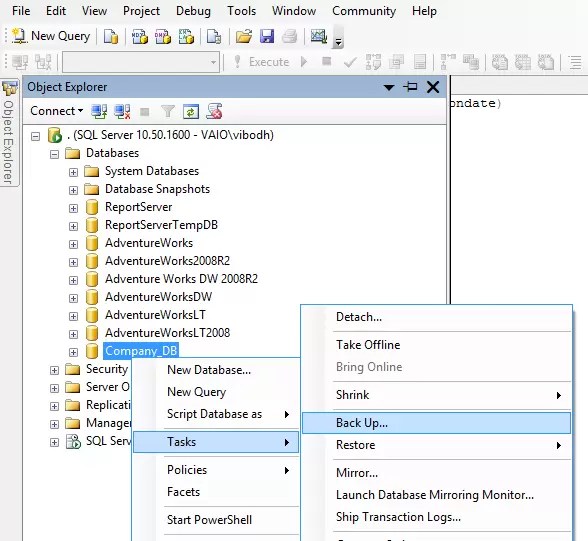 Step3:- Under the Databases node, select the database for backup and right click on it. Then choose Tasks and then Back Up.. as shown in the below figure. Here we choose the Company_DB as database.