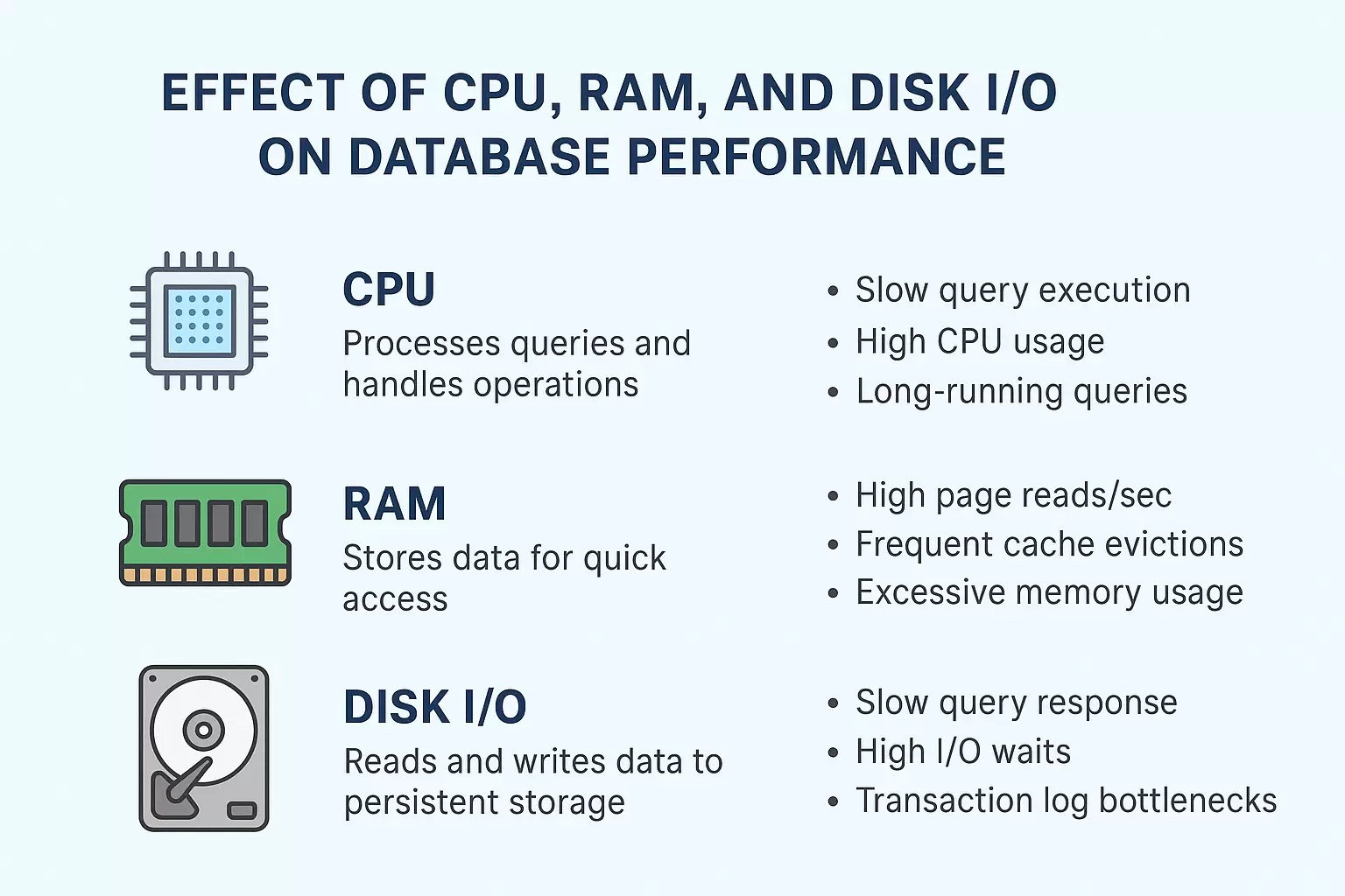 🔹 Effect of CPU, RAM, and Disk I/O on Database Performance